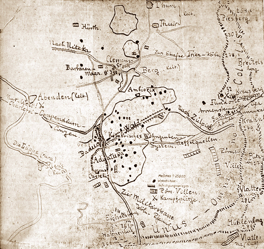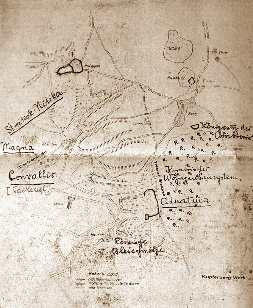 (3. Fortsetzung) Nach einer strategischen Pause von sechs Monaten beantworte ich den letzten Satz meiner Abhandlung vom 26. Juni 1937 (Volksblatt Euskirchen, Nr. 145): Was geschah inzwischen draußen auf den Getreidefeldern hinter der Hügelkette? Die zum Fouragieren vom Lagerkommandanten Cicero von Aduatuca ausgesandten fünft Kohorten hatten gerade ihre Arbeit auf den Getreidefeldern in der Linie Muldenau-Embken-Juntersdorf-Bürvenich beendet (Cäs. Buch 6, Kap. 39). Da hörten sie den Lärm vom Ansturm der 2000 sygambrischen Reiter auf die Tore ihres Standlagers. Sehen konnten sie nichts, denn der unus omnino collis, d. h. die Hügelkette, versperrte den Blick auf das Lager. Die auf das Hintertor des Standlagers losstürmende Reitermasse der Sygambrer hatten sie auch nicht sehen können, wie sie durch den dort befindlichen Wald gedeckt war (S. Karte 1). Um Klarheit zu bekommen, sprengt die zum Schutze der fouragierenden Kohorten mit ausgezogener Reiterei auf die Hügelkette und sieht, daß der Rückzug ins Lager versperrt ist. Die Troßknechte laufen auf den nächsten Hügel; in proximum tumulum sagt Cäsar. Dieses tumulus ist der auf Karte I eingezeichnete 52 Meter hohe Kreuzberg. Cäsar unterscheidet hier ausdrücklich zwischen einem tumulus und dem iugum, d. h. dem Kamm der Hügelkette, auf dem die altgedienten kriegserfahrenen Soldaten Stellung nehmen. Der Kamm der Hügelkette (s. Karte I) vom Eichelsberg bis zum Piesberg ist durchschnittlich 290 Meter hoch. Die kleine Anhöhe des Kreuzberges - mitten in der Hügelkette, da, wo das Neffeltal direkt zur Porta decumana von Aduatuca führt - dagegen nur 52 Meter. Daher Cäsars genaue Unterscheidung zwischen iugum und tumulus. Das Drama, das sich nun abspielt, ist kurz: Die altgedienten Legionäre, mit allen Wechselfällen des Krieges vertraut, stürmen mitten durch die Feinde zum Lager vor und erreichen es auch ohne einen Mann Verlust. - Troßknechte und Reiter bekommen dadurch Mut und erreichen ebenfalls das schützende Lager. Die fünf Kohorten aber - also ca. 3000 Mann - die auf der Höhe geblieben waren, gerieten bei ihrem Versuche, das Lager zu erreichen, auf ungünstiges Gelände (Cäs. Buch 6, Kap. 40). Dieses ungünstige Gelände ist das Gebiet der Neffelquellen, das vor ca. 150 Jahren noch ein regelrechtes Sumpfgebiet war. Zwei von diesen fünf Kohorten wurden dort von den sygambrischen Reitern bis auf den letzten Mann niedergemacht.