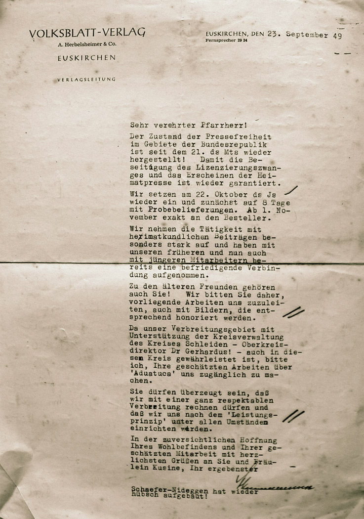 Korrespondenz mit A. Herbelsheimer Zum Wiedererscheinen des Euskirchener Volksblattes