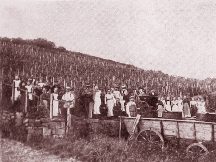 Essen, Kleidung und Trinken sind Naturbedürfnisse der Menschen. Und vor allem das Trinken scheint unsere Vorfahren genau so gut beherrscht zu haben wie ihre Nachkommen; denn was sollten wir sonst aus den vielen Schüsseln, Amphoren und Füllhörnern mit Trauben, Äpfeln und Birnen schließen. Die Amphore steht naturgekühlt im Keller. Sie kann Gerstenbier, Obstmost, Honigwein und sogar Essig enthalten haben, am ehesten aber Traubenwein. Die Weinrebe wurde am Rhein schon in vorrömischer Zeit angebaut. Die Römer haben aber viel zur Förderung des Weinbaus getan, vor allem der Kaiser Probus (um 280 oder 290 n. Chr.) Nach Angaben alter Schriften führte er den Weinbau an Rhein und Mosel ein; er erhob das Verbot, das Keltenland und Germanien mit Wein zu beliefern auf, und ließ Weinberge durch seine Soldaten anlegen. Votivsteine an der Neffel sind ein Beweis dafür, daß man spätestens im 1. und 2. Jahrhundert nach Chr. an Rur und Neffel Traubenwein, Gerstensaft und Bier kannte. Die älteren Generationen erinnern sich noch, wie man im mittleren Rurtal, besonders bei Winden Wein kelterte (Abb. 6). Auf den landwirtschaftlichen Ausstellungen in Düren in den Jahren 1890 bis 1900 konnte man den roten Windener Rachenputzer noch regelmäßig sehen, aber nicht mehr probieren. Dem Herzog von Jülich wird seine gute alte Stadt Düren vor ihrem Rathause eine bessere Marke Windener kredenzt haben, aber nicht den Dreimännerwein - so genannt, weil 2 Männer den Trinker festhielten, weil er sonst umgefallen wäre. An alten Häusern in Winden sieht man noch als Wahrzeichen Weintrauben (Abb. 5) und über dem Eingangstor des Zehnthofes in Wollersheim eine Gerstenähre aus Trierer Sandstein (Abb. 7). Bei allen Dörfern des oberen Neffeltales erkennt man noch heute an den Resten der Erd- und Steinterrassen die alten Weinberge. Historische Funde, die bei der Bade und im Quellgebiet der Neffel gemacht wurden, bestätigen uns den Ackerbau schon vor 3000 Jahren vor Chr. an Rur und Neffel. Besonders bei Embken wurden Steinbeile gefunden, weiter neffelabwärts häufen sich die Funde. In Eschweiler über Feld (= in agris Cäsars) und in Birkesdorf fand man Pflugschare aus Stein. Der Löß, an der Rur und Neffel Mergel genannt, zog die Bandkeramiker an. Heute noch sieht man dunkle Stellen in den Äckern. Es sind die Wohn- und Vorratsgruben der Bandkeramiker. Die Füllhörner unserer Matronen auf den Steindenkmälern sind mit Äpfeln und Birnen gefüllt. Schon Tacitus schreibt in seiner Germania: Obstbäume gedeihen dort.