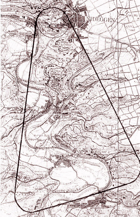 7) Das Ambiorix-Denkmal gehört nach Blens In allen Marken des Reiches des Ambiorix sandte Cäsar die Legionen oder Hilfsvölker aus, zu morden, zu brennen und zu rauben. Cäsar verschweigt hier den wahren Grund seines Vorgehens, daß nämlich seine ganze Rheinpolitik auf dem Spiele stand, wenn Ambiorix seinen Sieg bei Aduatuka hätte ausnutzen können. Ambiorix ist und bleibt der große Nationalheld, nicht nur in Belgien, sondern auch bei uns. Denn wir leben mitten im Eburonenlande. Sein Denkmal würde im Bereich der Ortschaft Blens den richtigen Standort haben. 8) Wo das Kastell zu suchen ist; nach Pfarrer Andreas Pohl Der archäologische Befund zur Bestimmung des Kastells Aduatuka der alten Fliehburg und Cäsars Winterlager nach Pfarrer Andreas Pohl: Vier Befestigungen schützen die Gutswache: 1. Im Norden: Niteca (Nideggen) 2. Im Osten: Muschling und Wattling, eine rund vier Hektar umfassende Wald- und Grabenbefestigung mit anschließendem langen Wall, ausgedehnten Steintrümmern und vorgeschichtlichen Anlagen im Sittard 3. Im Westen: Der Gutswache der Hondjesberg oder Hondjesley, eine Befestigung mit Wall und Graben. 4. Im Süden: Der Rädelsberg (Wasserberg) mit seinen weiten Lagerräumen mit dem Grubensystem, durchschnitten von einem langen gradlinigen Wall, den man als Grenzwall deuten kann. Zum Rurkessel: Die steil abfallenden Felswände und Steilhänge, für eine Verteidigung sehr geeignet - so verblieb Pfarrer Andreas Pohl bei seiner letzten These - Cäsars Castellum Aduatuka hier am Rädelsberg einzuordnen. Er sah da die optischen Voraussetzungen jener Westwand der Konglomorate zwischen Blens und Hausen, jedoch erkannt auch er, daß die Gegend um den Rädelsberg mit den zahlreichen Texthinweisen bei Cäsar teils nur bedingt im Einklang zu bringen sind und auch wegen der Enge des Raumes nur schwerlich überzeugen konnte (Dr. Albert Jackels). Schließlich rang er sich zu der Erkenntnis durch, daß hier an den Steilhängen der Rur das Castellum Aduatuka, die Fliehburg, jenes römische Winterlager - im Bereiche der Bade am besten zu suchen sei. Und wie Recht er haben sollte - es war nur ein anderer Berg - gegenüber auf der anderen Seite der Rur. So ist ihm der schlüssige Beweis nicht gelungen und so schließt er seinen Aufsatz mit dem Stoßseufzer: Aus der Aduatuka-Forschung klingt immer wieder der Ruf: Das Lager, das Lager! Wo ist es im Lande der Eburonen? Möge das Rheinische Landesmuseum in Bonn recht bald den Spaten ansetzen, und uns Cäsars Lager zeigen. Unser verdienter Heimatforscher Pfarrer Andreas Pohl verstarb 1963. Sein Freund Heinrich Fischer, Landwirt und Bürgermeister von Berg bei Nideggen folgte ihm 1965. Das Bonner Jahrbuch des Rheinischen Landesmuseums Bonn brachte bis heute noch keine Erfolgsmeldung. Wieder versank für Jahrzehnte Cäsars Castellum Aduatuka im Treibsand der Geschichte. Dann tauchten wieder neue Theorien auf, unbekümmert der den letzten Forschern bekannten Tatsache, dass die Aduatuka-Frage sich historisch und philologisch beinahe ausgelaugt darstellt. So blieb das Cäsar-Lager Aduatuka aufzufinden und festzulegen eine Empfehlung für Heimatforscher zu weiteren Forschungen, so schrieb der Kölner Heimatforscher Dr. A. Jäckels, Köln. 9) Wo das Kastell zu suchen ist - nach Ferdy Hake - 30 Jahre später - ein neuer Anfang - eine neue Theorie Begonnen wurde mit dem Nachvollzug der Forschungen von Pfarrer Andreas Pohl. Es wurde ein Erlebnis mit viel Zeit verbunden, den Begrenzungen, der Ausdehnung von Aduatuka nachzugehen und mit etwas Spürsinn wieder zu entdecken. Nur so lassen sich die großen Verdienste unseres unermüdlichen Bodenforschers auch nur erahnen. Es vergingen Jahre und so entwickelte sich eine neue Theorie: Pfarrer Andreas Pohl verblieb mit seiner Forschung bei seiner Suche nach dem Lager immer im Bereich des Badewaldes auf der rechten Rurseite, so daß ich hier die Suche nach dem Lager in Kenntnis der Arbeitsweise von Andreas Pohl als ausgeschöpft betrachtete. Ohne Frage dürfte auch hier noch die Bodenforschung im Allgemeinen noch manche Überraschung bereithalten. Es war somit erforderlich, die Höhe des Badewaldes zur Suche bzw. Entdeckung des Lagers zu verlassen. Um nunmehr die Situation global zu übersehen, bediene ich mich wie bisher so oft der Luftarchäologie: Mit meinem Sohn als Flugzeugführer starten wir vom Militärflugplatz Nörvenich zur Luftaufklärung um eine Spur jenes Kastell Aduatuka zu suchen. Hierfür steht uns ein Motorsegler zur Verfügung, der die Abschaltung des Motors gestattet und somit als Segelflugzeug eine ruhige Beobachtung und Kameraführung ermöglicht. Im Anflug über den Badewald und in mehreren Schleifen über dem Abender Talkessel und der Rur hinweg zur Ortschaft Blens war der Flug von einigen Flugturbulenzen begleitet. Über Blens entlang des Weges auf den Schärperberg zu, um dann im Bogen abzudrehen und wiederholt vom Schärperberg dem Tal des Odenbaches zu folgen. Diese Anflüge bereits brachten uns eine grundlegende Erkenntnis: Am Fuße des Schärperberges liegen im Grün der Wiesen beginnend in voller Breite - in ihrer Fortsetzung bergaufwärts die Terrassen - durch den Baumbestand sichtbar gut und deutlich zu erkennen.