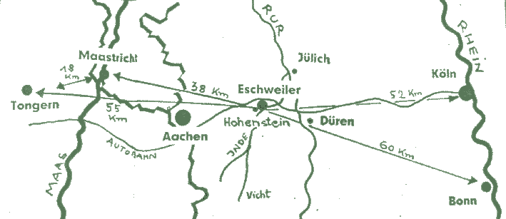 Das Land zwischen Rhein und Maas tritt durch den Eroberungskrieg des römischen Feldherrn Julius Cäsar (59-51 v. Chr.) in das Licht der Geschichte. In diesem Raum siedeln nach Cäsars Aussage linksrheinische Germanen, u. a. die Eburonen. Diese empören sich gegen die römische Besatzung im Lager Atuatuca, locken sie durch eine Kriegslist aus dem verschanzten Platz heraus und legen dem abziehenden Heer einen Hinterhalt in einem weiten Talkessel. Dabei finden etwa 9000 Legionäre den Tod. Der Anführer der Eburonen ist ihr König Ambiorix, ein linksrheinischer Arminius, der seinem Volk jedoch die Freiheit nicht zu erhalten vermochte, im Gegenteil. Cäsar rächt sich, indem er den Stamm der Eburonen ausrottet: ein Völkermord in unserer Heimat! Seit eh und je sucht man das Lager Atuatuca ohne es bisher einwandfrei lokalisieren zu können. Selbst auf der Suche nach Atuatuca, glaubt der Verfasser es auf dem Hohenstein bei Eschweiler am 1. Juni 1974 gefunden zu haben. Eine ausführliche Arbeit über die Eburonen ist in Vorbereitung. Am 29. Mai 1974 brachte die Aachener Volkszeitung eine aufregende Nachricht unter der Überschrift Hauptquartier der Eburonen entdeckt? Sensationeller Fund bei Maastricht - 380 m langer Palisadenwall ausgegraben. Bei Abgrabungen für die Zementindustrie auf dem Pietersberg am Westufer der Maas südlich von Maastricht fand man im Bereich des kleinen Ortes Caestert - der Name leitet sich her vom lateinisch castra = Lager - einen äußeren Erdwall mit einem Palisadenzaun, dahinter einen Wassergraben und anschließend einen zweiten, inneren Erdwall. Dieser Wall bildete eine Seite eines römischen Lagers, so daß, laut Zeitungsbericht, die Archäologen hier das von den Römern angelegte Lager Atuatuca Tungrorum vermuten, das die Eburonen nach deren Abzug oder Vertreibung besetzt und zu ihrem Hauptquartier gemacht hätten. Nun erhebt auch die Stadt Tongern in Belgisch Limburg den Anspruch, das Atuatuca Tungrorum zu sein, weil dieser Name für die spätere Römerzeit bezeugt ist und der Stammesname im Stadtnamen weiterlebt. Da unser einziger Gewährsmann, der römische Feldherr Julius Cäsar, in seinem Bericht Über den Gallischen Krieg nur von Atuatuca ohne Zusatz spricht und die Tungerer überhaupt nicht erwähnt, muß Tongern nicht notwendigerweise, dieses von Cäsar genannte Atuatuca sein. Demnach müßte es mehrere Atuatuca gegeben haben, ein Name, der auch in der Bezeichnung des im Innern Belgiens siedelnden Stammes der Atuatuker, Nachkommen der Kimbern und Teutonen, vorliegt. Könnte das Römerlager auf dem Pietersberg mit dem Atuatuca Cäsars identisch sein? Unsere Antwort lautet: Nein! Cäsar sagt nämlich, das Land der Eburonen liege zum größten Teil zwischen Maas und Rhein (V 24), und das castellum Atuatuca liege fast in der Mitte des Eburonenlandes (VI 32). Das Siedlungsgebiet des Stammes erstreckt sich entlang der Nordabdachung von Eifel und Ardennen und reicht im Westen noch etwa über die Maas hinaus. Auf Grund dieser Angaben kann das cäsarische Atuatuca nicht jenseits der Maas liegen - weder bei Maastricht noch in Tongern. Es muß im Raume Aachen gesucht werden!