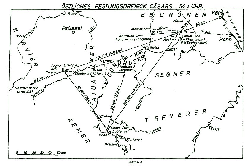 4. Die Entfernungsangaben des Ambiorix Von den induktiv ermittelten Standorten des Cicero in Binche und des Labienus bei Sedan aus müßte es nun möglich sein, auch den Standort des Lagers Atuatuca induktiv zu bestimmen. In seiner Unterredung mit den römischen Unterhändlern will Ambiorix dies zum Abzug bewegen und erklärt: Bei ihnen liege der Entschluß, ob sie die Soldaten aus dem Winterlager herausführen wollten, ehe die Nachbarn etwas davon vernähmen; sie könnten die Soldaten entweder zu Cicero hinführen, der etwa 50 Meilen (74 km) entfernt sein Lager habe, oder zu Labienus, der nicht viel weiter entfernt sei (eductos ex hibernis milites aut ad Ciceronem aut ad Labienum deducere, quorum alter milia passuum circiter quinquaginta, alter paulo amplius ab iis absit. V 27,9). Zieht man von Binche und von der Öffnung der Maasschleife bei Sedan aus jeweils einen Kreis von 74 km Radius, dann liegt deren Schnittpunkt etwa 20 km südlich von Huy an der Maas. Verlängert man den bei Sedan angesetzten Radius z. B. um 10 % (paulo amplius), so rückt der Schnittpunkt entsprechend näher an Huy heran, doch in beiden Fällen gelangen wir nur bis in das Land der Condruser, die heutige Landschaft Condroz, und nicht in das Land der Eburonen nördlich der Maas. Im Rahmen der induktiven Beweisführung stimmen die Entferungsangaben des Ambiorix nicht. Umgekehrt sind auch alle Versuche, mit Hilfe eines Dreiecks Atuatuca - Cicero - Labienus - Atuatuca mit den Entfernungen 50 Meilen, 60 Meilen und nur wenig mehr als 50 Meilen (V 27,9), dessen Spitze man in Tongeren ansetzt, um das Lager des Cicero und des Labienus deduktiv zu lokalisieren, gescheitert. Von Tongeren zur Grenze der Nervier westlich von Brüssel sind es zwar nur knapp 60 km (kürzeste Entfernung), aber schon bis zu dem Punkt, wo die Heerstraße Tongeren - Bavai die Grenze der Nervier bei Morlanwelz überschreitet, und an dieser Straße muß das Lager des Cicero gelegen haben, sind es schon 90 km 34). Die kürzeste Entfernung zwischen Tongeren und der Grenze der Remer in den Ardennen nordöstlich von der Einmündung der Semois in die Maas beträgt knapp 105 km 35), eine Distanz, die man nicht mehr als nur wenig weiter denn 74 km betrachten kann. Wenn die Entfernungsangaben des Ambiorix sich schon bei ihrem Ansatz in Tongeren als unbrauchbar erweisen, dann erst recht für einen solchen östlich davon. Diese Analyse beweist, daß die Distanzangaben des Eburonenkönigs nicht glaubwürdig sind.