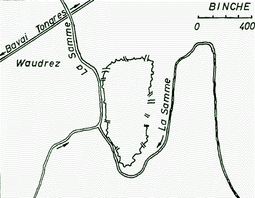 Nachdem der Eburonenkönig Ambiorix die Römer in der Schlacht bei Atuatuca besiegt hat (Herbst 54 v. Chr.), bricht er sofort mit seiner Reiterei nach Wesen auf, um das zwischen Atuatuca und Amiens gelegene Lager des Cicero anzugreifen. Dabei durchquert er das Gebiet der Atuatuker, die an sein Reich grenzen, gewinnt sie für sein Vorhaben und erreicht dann das Land der Nervier. Zu dritt beginnen diese Stämme nun die Belagerung des Cicero (V 38,1-2). Es gelingt diesem, das Hauptquartier in Amiens über seine bedrängte Lage zu benachrichtigen. Bei Erhalt des Hilferufes bricht Cäsar mit einer Legion von Amiens um die dritte Stunde auf (9 Uhr) und legt an diesem ersten Tag 20 Meilen (30 km) zurück (V 47,1). Er hatte C. Fabius im Lande der Moriner den Befehl zugeschickt, mit seiner Legion unterwegs zu ihm zu stoßen, und zwar solle er in das Land der Atrebaten (Raum um Arras) marschieren, da er, Cäsar, selbst den Weg dorthin nehmen müsse (V 46,3). Fabius vereinigt sich befehlsgemäßt mit Cäsar vermutlich in Arras, doch trifft er etwas verspätet ein: Fabius, ut imperatum erat non ita multum moratus, in itinere cum legione occurrit (V 47,3). Offenbar war sein Anmarschweg auf der Straße Boulogne - Arras länger als der Cäsars auf der Straße Amiens - Arras. Letztere Strecke beträgt knapp 60 km (Zweiter Tag). Von nun ab führt ihr Weg sie gemeinsam weiter. Die Stärke der beiden vereinigten Legionen beträgt kaum 7000 Mann (V 49,7). Cäsar erblickt das Heil seines Rettungsunternehmens in der Schnelligkeit (V 48,1). Er erreicht das Land der Nervier in Eilmärschen (V 48,1). Hier erfährt er von den Gefangenen Genaueres über die Lage Ciceros. Er schickt einen gallischen Reiter an ihn ab mit einem Brief, in welchem er ihm mitteilt, er werde rasch zur Stelle sein (V 48,6). Während die Legionen marschieren, reitet der Bote. Am Ziel angekommen, befestigt er den Brief an einen Wurfspieß und schleudert diesen in das Lager, dort bleibt er jedoch an einem Turme zwei Tage hintereinander unbemerkt hängen (V 48,8). Der Brief wird erst am dritten Tag nach seinem Abwurf entdeckt, doch schon bald danach sieht die Lagerbesatzung Rauchsäulen in der Ferne aufsteigen, die das Nahen Cäsars ankünden (V 48,10). Cicero schickt ihm einen Brief und meldet ihm, die Nervier hätten die Belagerung abgebrochen und zögen ihm entgegen. Cäsar erhält diese Nachricht gegen Mitternacht (V 49,4) (Fünfter Tag). Am frühen Morgen marschiert er 4 Meilen (6 km) weiter, schläft ein Lager auf und erwartet hier die Nervier, denn da er Cicero außer Gefahr weiß, kann er sein Marschtempo verlangsamen (V 49,6). Doch es verstreicht der Rest des Tages mit Reitergeplänkeln an einem Bach (V 50,1) (Sechster Tag). Erst am folgenden Morgen kommt es zur Schlacht. Cäsar siegt und gelangt noch an demselben Tage (V 52,1) nach der neunten Stunde (V 53,1), nach 3 Uhr nachmittags also, zu Cicero (Siebter Tag). - Den sechsten und siebten Tag können wir wegen des unterbrochenen Marsches zu einem einzigen Marschtag zusammenziehen. Cäsar hat mindestens fünf volle Marschtage und einen angebrochenen sechsten benötigt, um das Lager Ciceros zu erreichen. Falls wir das Tempo des ersten Tages, nämlich 20 Meilen, als durchschnittliche Tagesleistung ansehen, dann war dies der Zeitaufwand, der etwa erforderlich war, um eine Strecke von rund 100 Meilen (148 km) zurückzulegen. Da kein Lager weiter als 100 Meilen von dem nächstgelegenen entfernt war, muß dasjenige des Cicero an der Grenze dieses Maximalabstandes gelegen haben. Camille Jullian lokalisiert es versuchsweise, hypothétiquement, in den Städtchen Binche 21 km westlich von Charleroi, sur la grande route du Nord, d'Amiens à Cologne 13). Von hier bis Amiens sind es in Luftlinie 146 km, von hier bis zur Ostgrenze der Nervier, an der das Land der Atuatuker begann, waren es noch etwa 10 km 14). Wir schließen uns dieser Ortsbestimmung an, da zwingende Größe für sie sprechen. Die heutige Stadt Binche 15) liegt auf einem ebenen Plateau, dessen Ränder steil zu der Samme abfallen, die es von drei Seiten umfließt. Der Fluß ist heute unterirdisch kanalisiert. Das Plateau erhebt sich stellenweise beinahe senkrecht bis zu 15-20 m über der Talsohle und bildet ein nahezu regelmäßiges Rechteck von etwa 600 m Länge und etwa 350 m Breite mit einem Flächeninhalt von ca. 21 ha. Nach Süden zu, wohin es leicht ansteigt, setzt es sich in einem beinahe gleichschenkligen Dreieck von etwa 320 m Seitenlänge und etwa 210 m Höhe fort, was einem Flächeninhalt von etwa 3,4 ha ergibt. Die Gesamtausdehnung würde demnach ca. 25 ha betragen, eine Größe, die für die Legionslagen in Bonn und Neuß archäologisch nachgewiesen ist 16). Die mittelalterliche Stadt Binche hat die Steilränder des Plateaus mit hohen Mauern und vorspringenden Halbtürmen eingefaßt und diese Wehr über die ungeschützte Nordseite weitergeführt, so daß ein rundum von Mauern umsäumtes Areal entstand, dessen Gürtel noch beinahe vollständig erhalten ist mit einer Gesamtlänge von etwa 3 km. Diese Stadt liegt nicht hinter ihren Mauern, sondern auf ihnen. In der Annahme, daß dieser Umfang auch der des Lagers war, würde er die Länge des Einschließungswalls und grabens erklären, den die Nervier rund um dasselbe anlegten. Der Wall war 3 m hoch, der Graben 4,50 m breit (V 42,1), die Anlage 15000 Fuß oder 4,5 km lang (V 42,4). Das ergibt einen Abstand zum Lagerrand von etwa 240 m 17). Vermutlich waren die Belagerer bei dieser Entfernung außerhalb der Reichweite römischer Wurfmaschinen, wenngleich die Römer auch schwere Belagerungsartillerie besaßen, die Steine von einem halben Zentner beinahe 400 m weit schleudern konnte 18).
