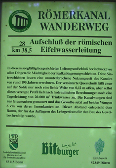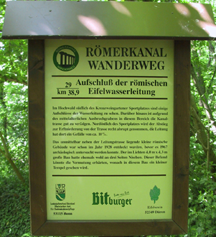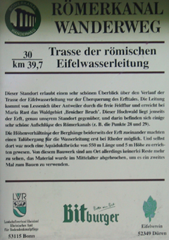 Neben dem Kreuz auf dem Burgberg, auf der anderen Seite des Kreuzweingartener Tals, steht eine Tafel des Eifelvereins Düren, der die Lage des Römerkanals näher bezeichnet: |